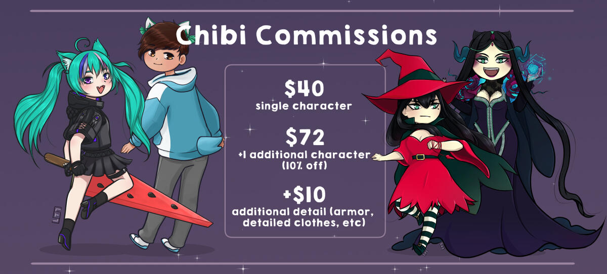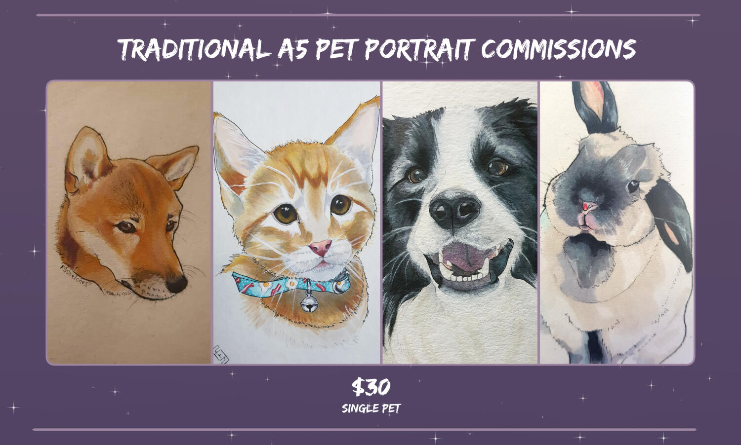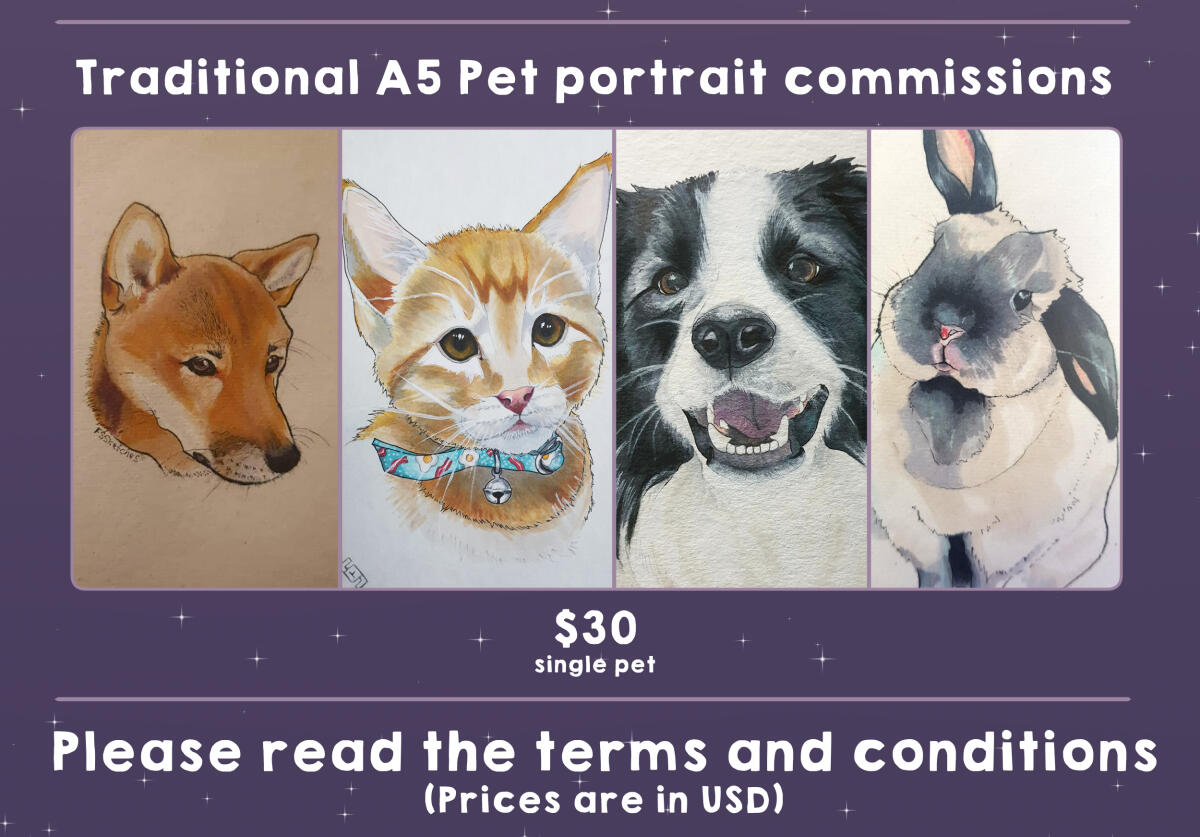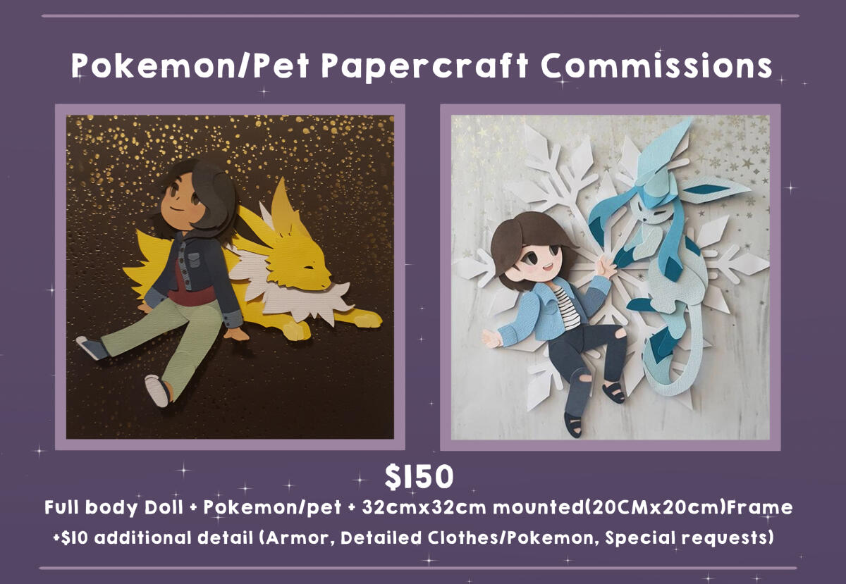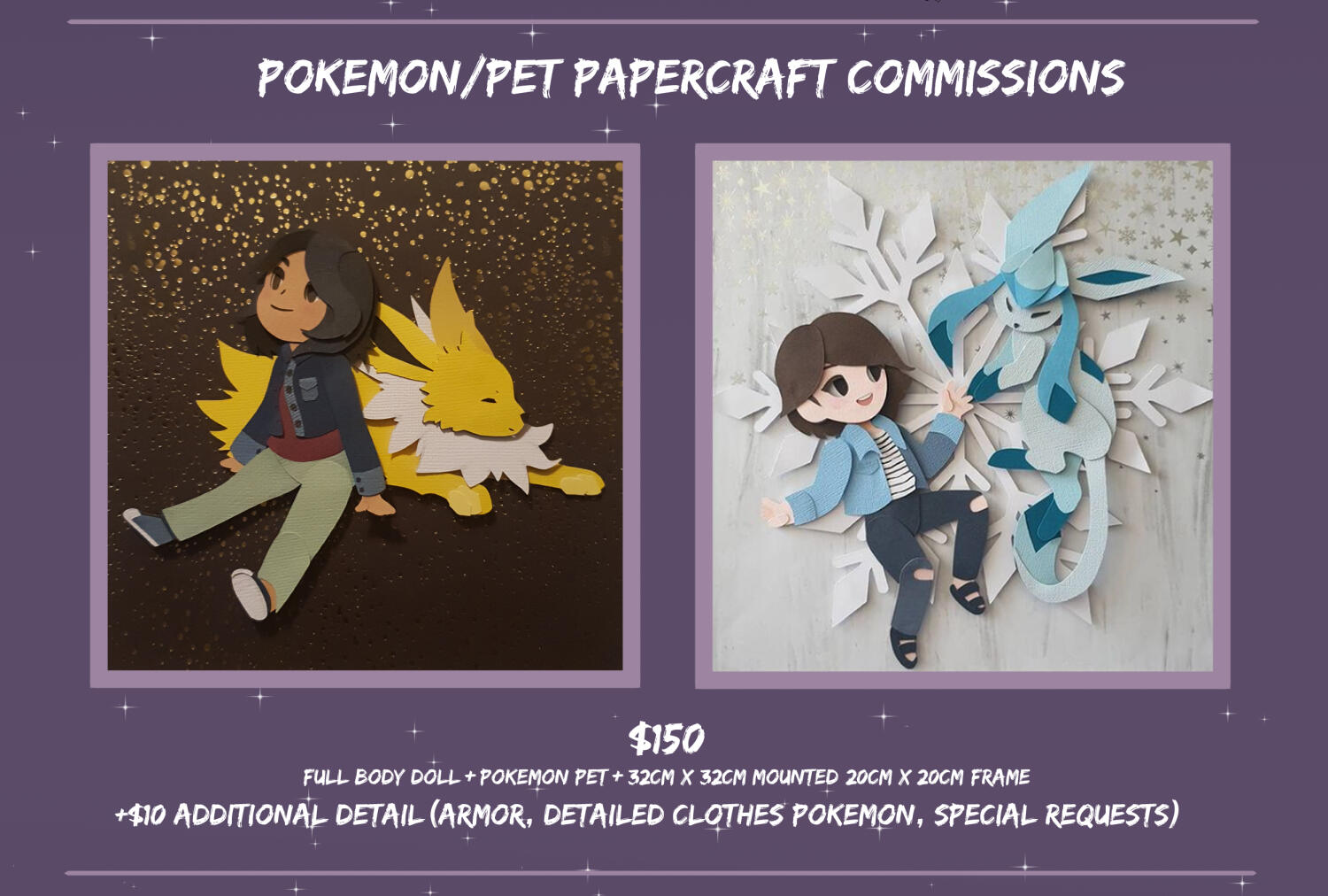 FAQ✦ Can I ask how my commission is going?You may ask for updates, but please don't do this daily.✦ Can I request something different then what you are offering?I am open to special requests with additional fees. Please keep in mind that since it's not what I am offering as normal, it might be declined.✦ I need the commission ASAP and can't wait more than a month, can you finish it within a week?A rush fee can be applied if you need to have it ASAP.✦ What if I'm not satisfied with the end product?I do my best to minimalise this through sketch/flat colour approvals in the production stages. If you are not satisfied with the final piece I will not give refunds or redo the piece. However if I have missed minor details that have already been agreed to and you would like me to add them in, I will do my best to do so.DISCLAIMERS✦ 1 slot per person. This may change in the future.✦ Prices do not include postage for physical items (papercraft & pet portraits). Prices vary for postage depending on location, size and weight and will be discussed before sending.✦ I am not accepting international requests for papercraft and pet commissions at this time (sorry). Australia only, but this will change in the future.✦ Digital art pieces come with a simple gradient background only. Papercraft backgrounds will be picked by the artist that will match with the theme.If anything is unclear, please shoot me an email or private message me. Any questions about commmissions I am happy to answer at any time.