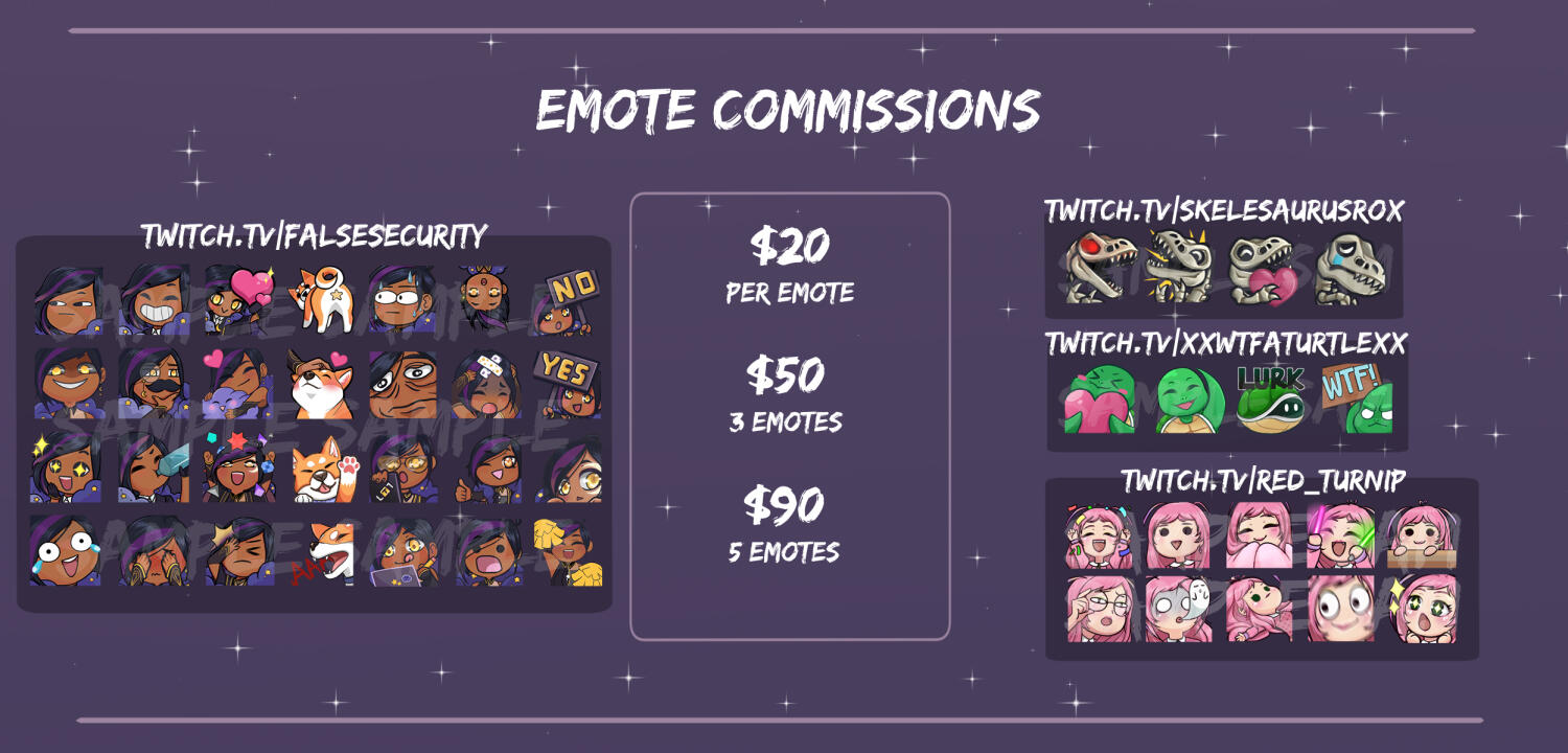 WORKFLOW✦ I will not start a commission until I have requested references.✦ I will not start a commission unless the form has been filled and emailed.Digital Art & Twitch EmotesAfter the design and payment is received, I will send multiple stages of the process to you before proceeding to the next step.